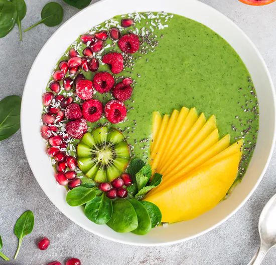 Meng de yoghurt met Alka® Greens tot een mooi glad geheel. Versier dit ontbijt met jouw favoriete muesli, lijnzaad, noten en vers fruit.