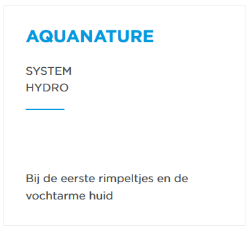 De veganistische systeemverzorgingslijn AQUANATURE biedt verzorging met vochtreservoir bij de eerste rimpels en een vochtarme huid met behoefte aan regeneratie. Stamcellen van de papyrusplant en andere waardevolle, natuurlijke verzorgende substanties voorkomen droogterimpels en ondersteunen de elasticiteit van de huid. Voor een gladdere, stralende teint.