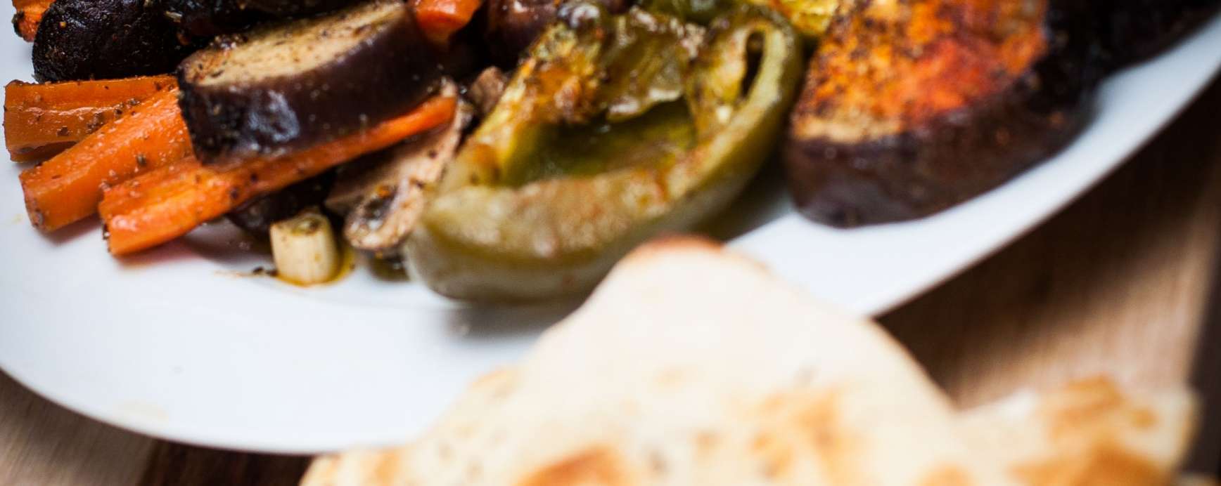 De antipasto van geroosterde groenten en de daslook mooi schikken en met vers brood serveren
