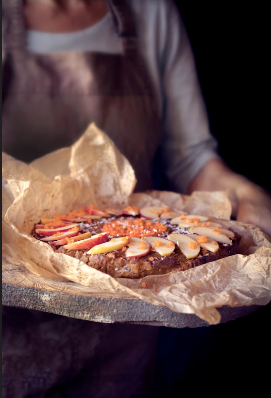 Was de appelen, schil de wortelen en rasp of blender deze mooi fijn. Doe alle ingrediënten (met uitzondering van de eieren en het natrium bicarbonaat) in een kom en meng het heel goed. Proef even of je nog iets wilt toevoegen. Is het mengsel lekker op smaak klop dan de eieren op en meng de natrium bicarbonaat erdoor. Doe een stuk bakpapier in een bak- of springvorm en zet de taart in een voorverwarmde oven op 150 graden een 50-60 minuten in de oven. Goed af laten koelen voor je de taart aansnijdt. Garneer de taart evenueel met wat wortel-of kokosrasp. Of als je een feestje te vieren hebt met wat lemoncurd of eierroom. (zie de recepten in mijn boeken)