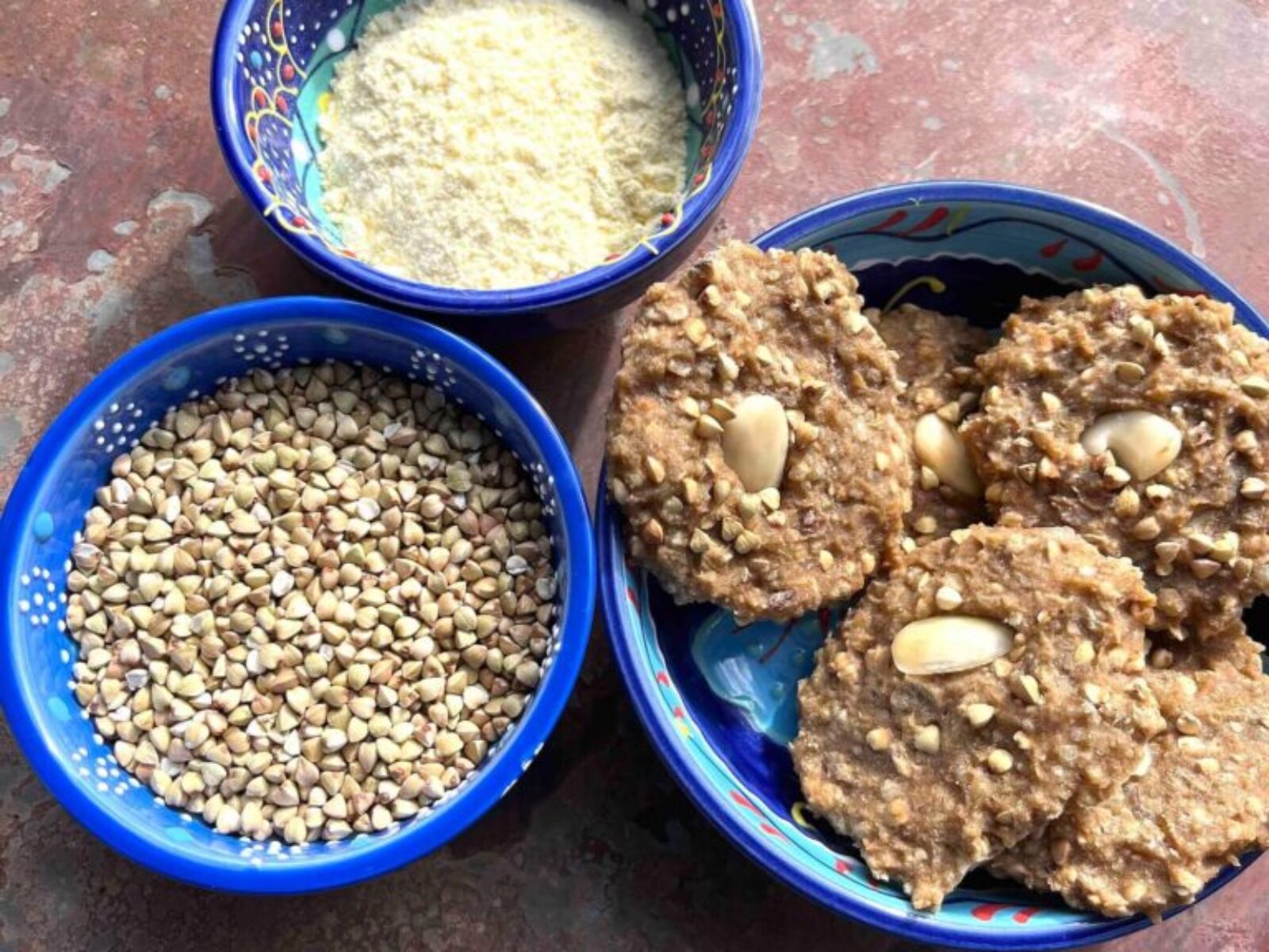 Blender de bananen heel fijn en doe de rest* van de ingrediënten erbij. Volg je eigen smaak, je hoeft uiteraard niet al deze ingrediënten te gebruiken. Proef of je het lekker vindt** Mocht je ‘beslag’ te nat zijn, voeg dan nog iets aan vlokken of meel toe. Maak er ongeveer 25 balletjes van, leg ze op een met bakpapier beklede bakplaat en druk ze plat met je handen. Druk er nog wat kasha en 1 of 2 amandelen op. Zet ze in de oven*** en BLIJF ERBIJ! Door de bananen en het maismeel krijg je snel AGEs en dat is zo jammer! Na circa een half uur kun je ze eventueel omdraaien om ze vervolgens nog circa 20 minuten te bakken. Crunchy worden ze overigens niet door de bananen.