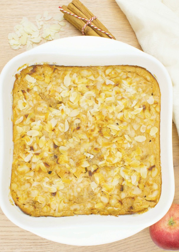 Meng de banaan, eieren, room, kaneel en zout tot een glad beslag. Gebruik een ondiepe bakvorm of ovenschaal zodat het mengsel volledig onder staat met het beslag. Snijd de appel en actief in blokjes van ongeveer 1 cm. en doe deze samen gemengd met de noten in de vorm.