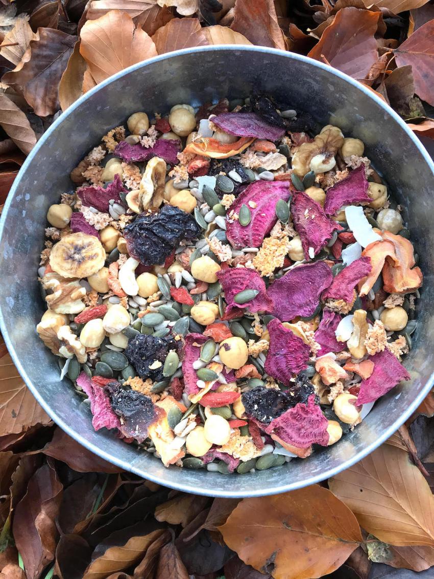 Over de bereiding hoef ik niet veel te zeggen, een kwestie van mengen en dan in een afgesloten pot bewaren. Mensen die een droogoven hebben kunnen het gros van de ingrediënten zelf drogen in hun droogoven. Zij zullen wellicht ook andere gedroogde fruit- en groentesoorten hebben. Zo heb ik zelf bijvoorbeeld overheerlijke stukjes wilde pruim, gedroogde aardbeien en zelfs gedroogde frambozen gedroogd. Wie geen droogoven heeft zal even op ‘jacht’ moeten gaan: tamme kastanjes en ook de rest van de ingrediënten, met uitzondering van de groenten, zal niet zo’n probleem zijn. In de natuurwinkels en online zijn ze gedroogd & zonder suiker goed te vinden. Voor de groenten zul je even meer speurwerk moeten verrichten. Stukjes gedroogde rode biet kom je volop tegen bij diervoeder webshops maar weinig bij andere (?) Toch is dit speurwerk echt even de moeite waard. De combinatie van deze Brein Smikkel levert je brein echt fantastische stoffen. Zie verder bij Gezondheidstips.