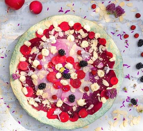Een heerlijke, oogstrelende carpaccio van koolrabi en rode biet.
