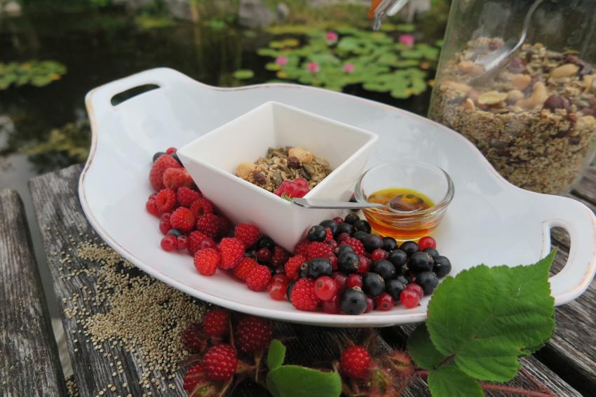 Erg lekker: rood zomerfruit met eventueel twee eetlepels rauwmelkse hangop of kefir*. Anders een scheutje granaatappelsap, ongezoet kersensap of wat amandelmelk. Voeg ook een scheut Omega 3 bevattende olie toe (zoals koolzaad, Happy Perilla, walnoot-, hennepolie.)