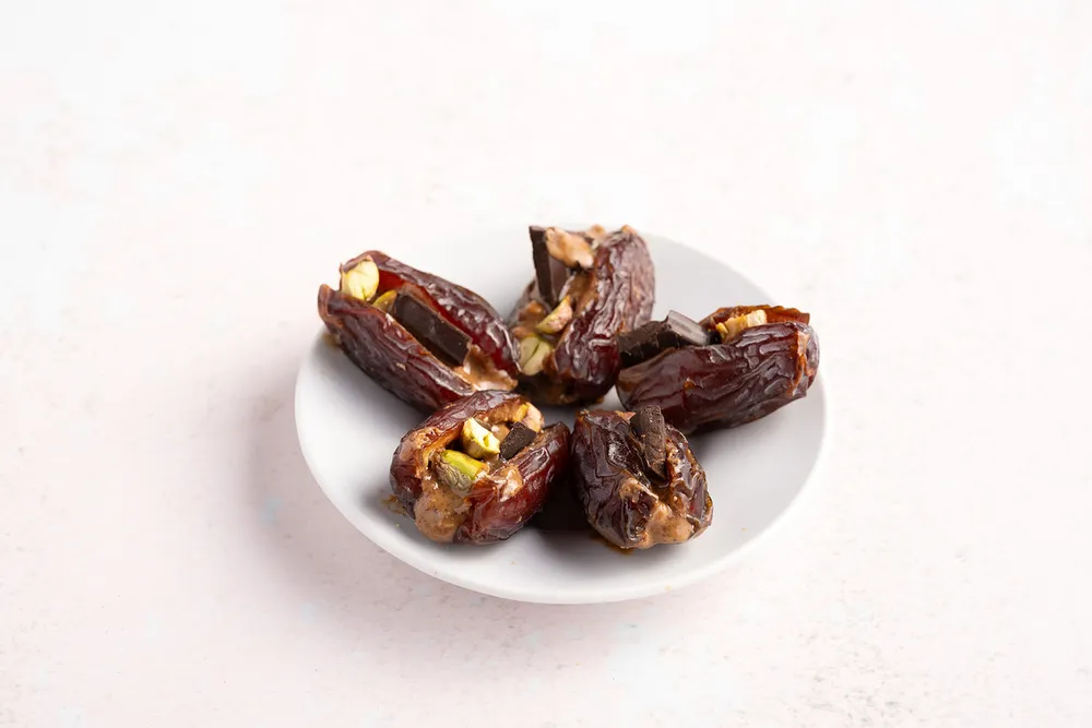 Gevulde dadels maar dan next level. Zoet, romig en crunchy tegelijk. Je vult zachte medjool (Medjoul) dadels met amandelpasta chai, pure chocolade en pistachenoten. Een vleugje zeezout maakt ze extra lekker. Makkelijk vegan snacken, ideaal als healthy zoet tussendoortje bij de koffie of als homemade alternatief voor luxe chocolade dadels uit de winkel.