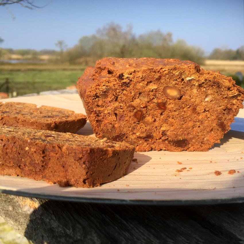 Ik vind deze koek een mooi voorbeeld hoe je met enkel het zoet van vruchten, wortelen en kastanjemeel toch iets met een zoete smaaksensatie kunt maken zonder ‘lege suikers’ te gebruiken. Zelfs van zoetekauwen hoor ik dat ze deze koek zoet genoeg vinden. Per plak van 50 gram zou deze koek 1.75 suikerklontje bevatten. Vaak zeggen mensen dat het niet uitmaakt welke suiker je eet: “suiker is suiker” is hun argument. Toch klopt dat natuurlijk niet helemaal: