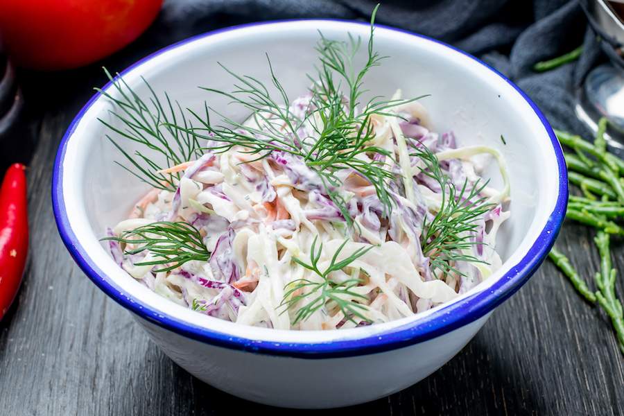 BereidingVerwijder eventueel de buitenste bladeren en snijd de kool (meerdere kleuren zoals witte, rode en palmkool zijn het mooist) en schaaf de met de mandoline heel dun. Schil ook de wortel en snijd ook deze heel dun. Met een goed mes heel dun snijden kan uiteraard ook als je geen mandoline hebt. Doe de groente in een kom en doe er 12 gram zeezout bij.(of misschien duidelijker: gebruik altijd 2% zeezout van het groentegewicht) Meng alles met schone handen goed door elkaar. Voeg 2 eetlepels witte balsamico- of appelazijn toe. Doe alles in de pickle (pers), doe de deksel erop en laat het ca. 24-36 uur staan onder druk staan. Vaak moet je na een tijdje de pers nog even weer aandraaien. Laat na deze bereidingstijd de pickle uitlekken in een vergiet. Doe er een een theelepel zeesla (truffelwier) door en meng in een kommetje de kefir met de honingmosterd. Voeg eventueel nog wat peper toe.