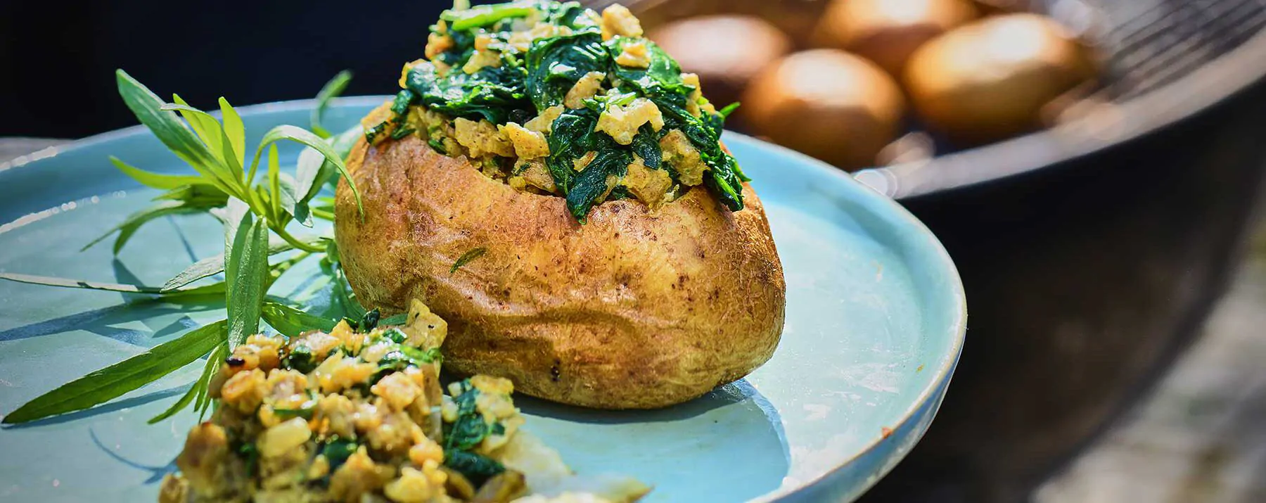 Bereiding van gepofte aardappel met spinazie en veggie gehakt voor op de bbq