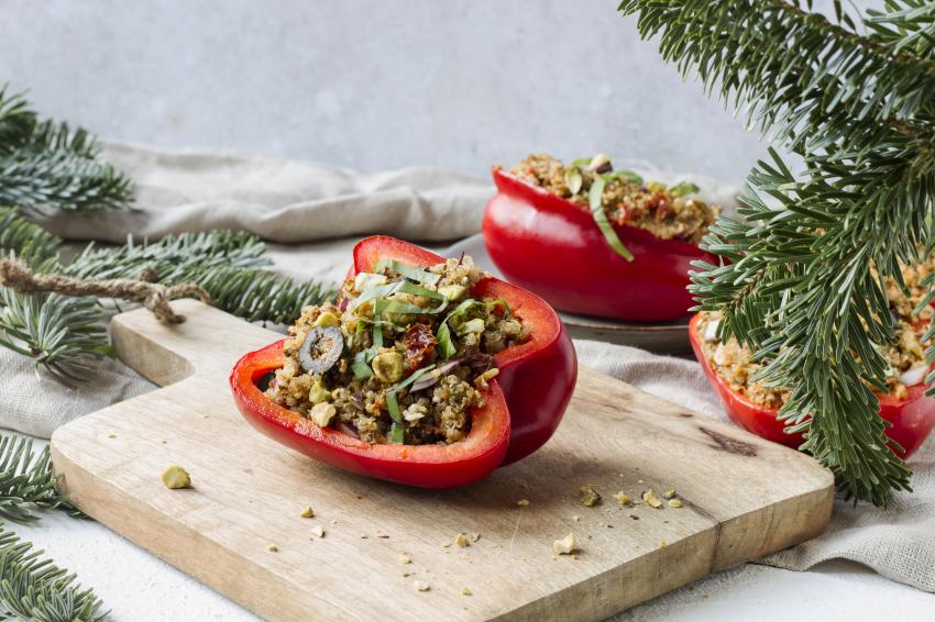 BereidingKook de quinoa volgens de verpakking gaar. Zet de oven aan op 140 graden. Snijd de paprika’s doormidden, verwijder de zaden en zaadlijsten. Zet ze in de oven. Meng de rest van de ingrediënten in een kom. Voeg de quinoa toe als deze gaar is. Verdeel het mengsel over de 6 paprika’s als deze beetgaar zijn. Druk goed aan. Zet nogmaals 10 minuten in de oven. Garneer met de noten en basilicum.