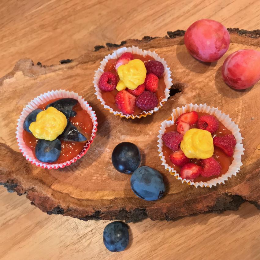 De muffins kun je heel goed invriezen. Beleg ze met seizoen fruit(moes zonder suiker) naar keuze. Ook erg lekker met suikervrije rozenbotteljam. (Ja, die bestaat echt!) Leg er een paar stukjes vers fruit bovenop. Erg lekker met een toefje haver 'slagroom' room of lemoncurd.