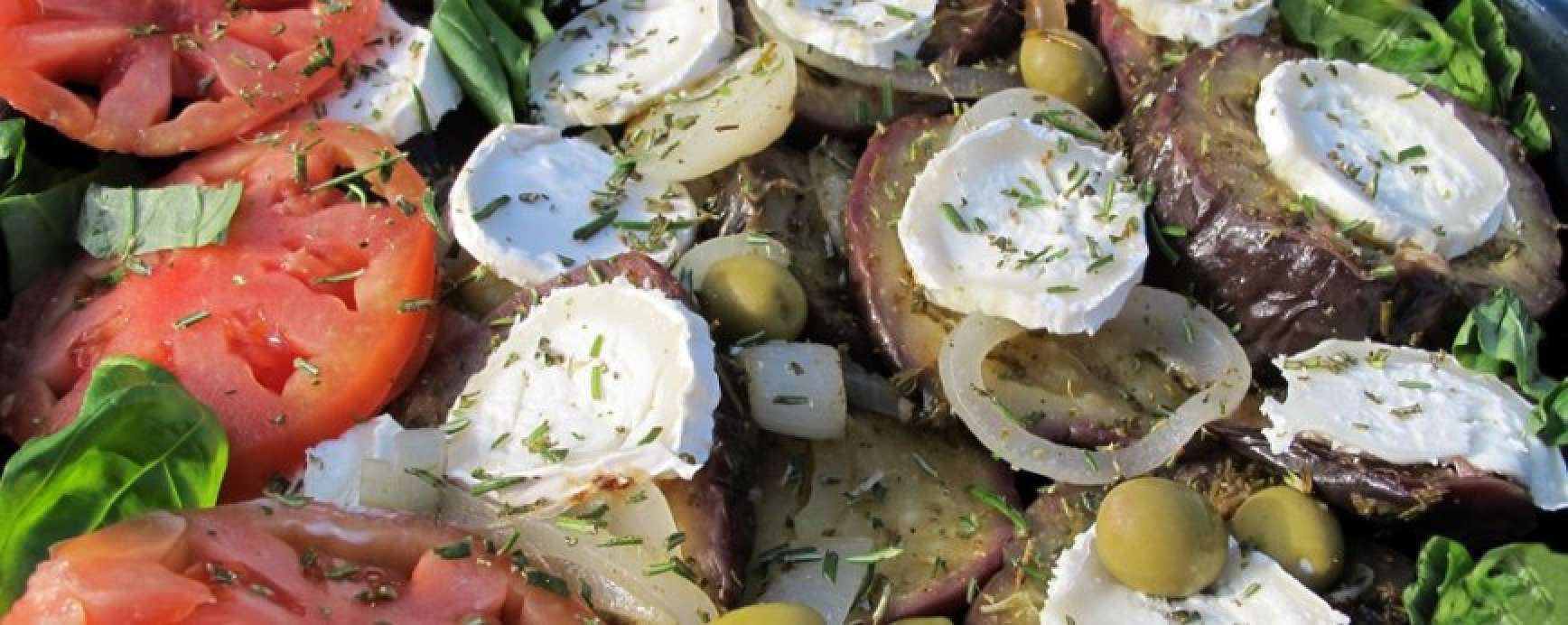 In een grote schaal leggen en op elk aubergineplakje een zeer fijn gesneden plakje geitenkaas leggen. De olijfjes er tussen schikken. De vleestomaat er ook tussen rangschikken en besprenkelen met een beetje olijfolie. Zet het gerecht nog een paar minuten in de oven/grill. Doe er vlak voor het opdienen eventueel de verse Provençaalse kruiden over. Serveer er desgewenst wat quinoa bij.