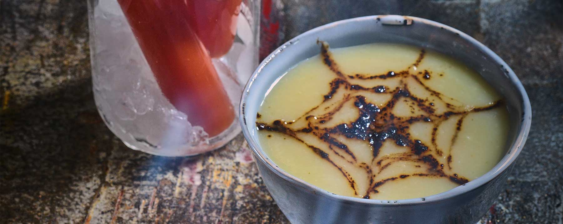 - Pureer de zwarte knoflook en maak met dit mengsel een spinnenweb of vleermuis in elke kom.