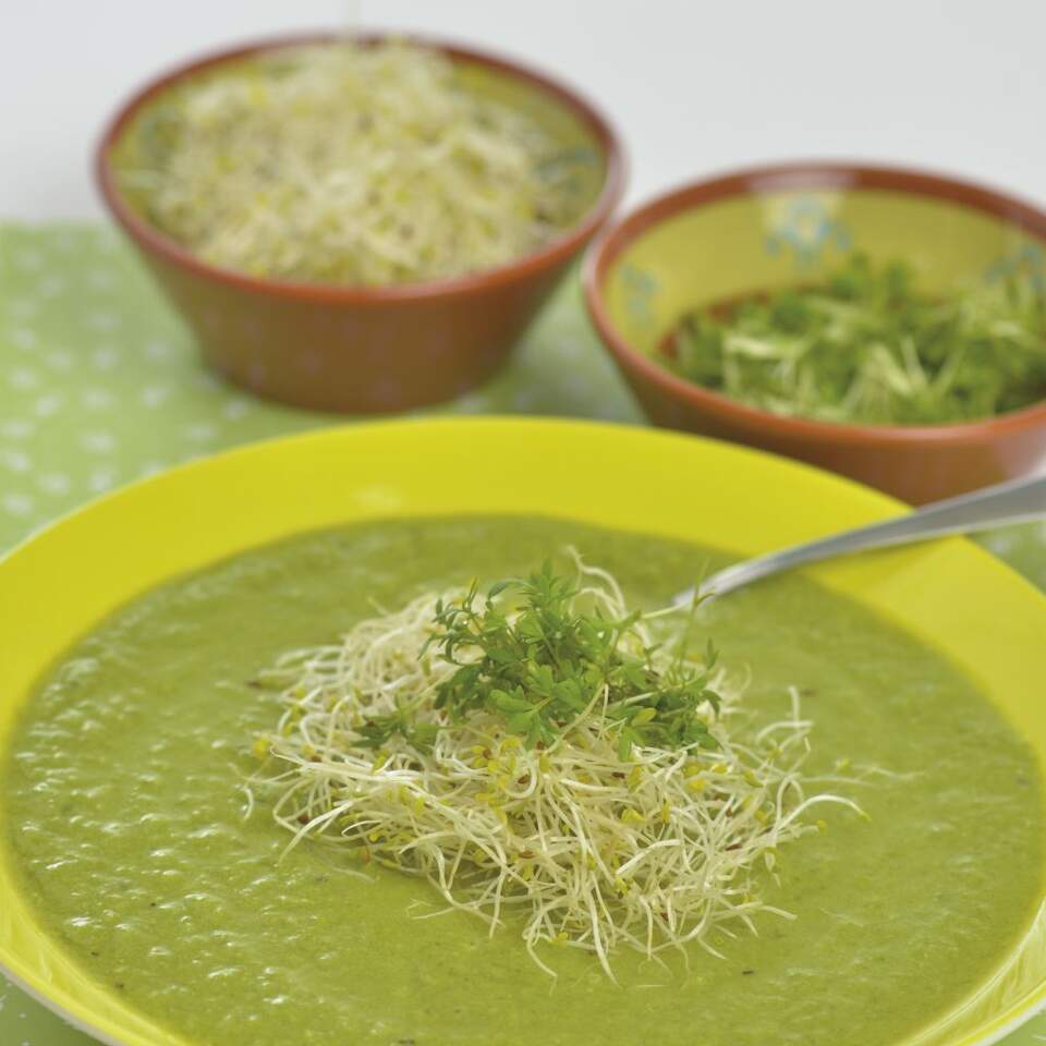 BereidingUi en knoflook fruiten in de kokosolie. Daarna het water met de bouillonblokjes aan de kook brengen. Vervolgens de broccoli, de in stukken gesneden aardappel en de bleekselderij en op het laatst eventueel de courgette erbij doen en gaar laten worden. Doe de groenten er pas in als het water kookt, dat vermindert het vitamineverlies door het kookproces (dit geldt overigens voor alle groenten die je kookt). De pan van het vuur halen, de soep pureren en rozemarijn erdoor doen. Op smaak brengen met peper en zout of shoyu. Eventueel garneren met de bieslook.