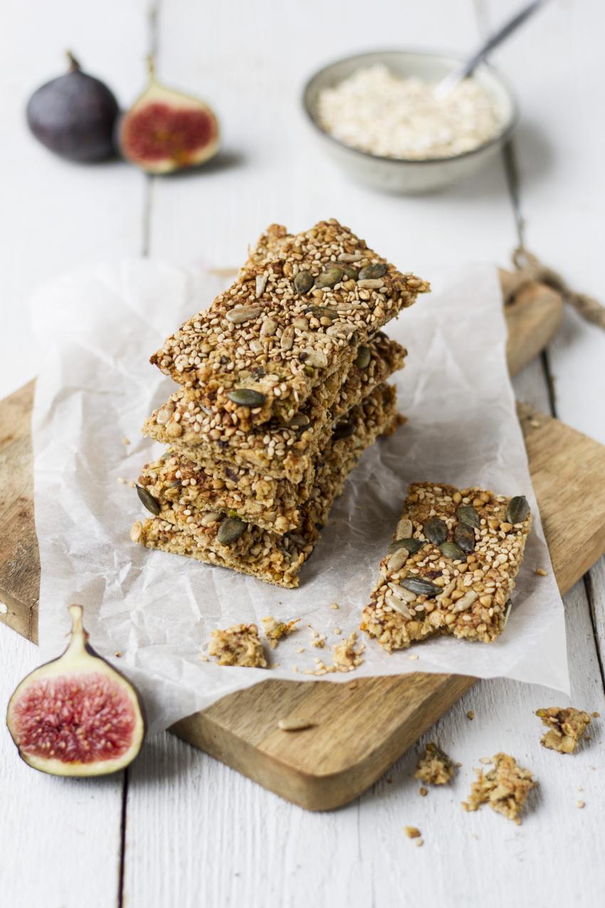 Vijgen pureren in een foodprocessor. Alle ingrediënten in een kom doen en tot een homogene massa kneden. Even proeven of je het goed op smaak vindt en eventueel nog iets van de ingrediënten toevoegen. Leg bakpapier op een bakplaat en leg het mengsel erop. Verdeel het met een lepel over de bakplaat, leg er een stuk folie over en rol het stevig en egaal over de bakplaat. Verwijder de folie, strooi de garnering erover en leg de folie er opnieuw over. Rol nog een paar keer stevig. Verwijder de folie en verdeel het blok in ca. 20 mueslirepen (meer of minder kan uiteraard ook) Zet ze in een voorverwarmde oven op 140 graden. Draai de repen na ca. 40 minuten voorzichtig om en zet nogmaals 10 minuten in de oven. Goed laten afkoelen en droog en donker bewaren. Een deel invriezen kan ook.