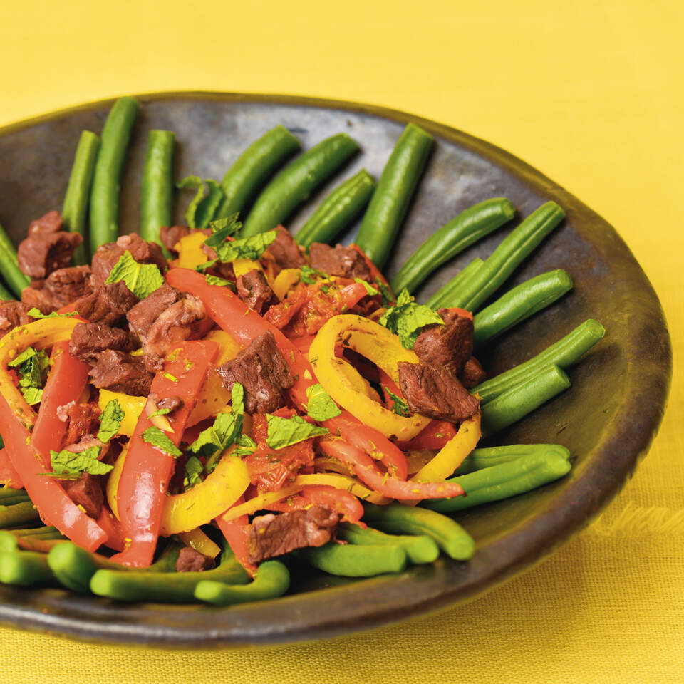 Snijd het vlees in dobbeltjes en bak het kort aan in de roomboter/kokosolie. Doe na een paar minuten de geperste knoflook, de rode wijn, peper en zout erbij. Laat een klein half uur sudderen tot het gaar is. Doe een scheut olijfolie in een andere (koeken)pan en fruit vervolgens de uien. Snijd de paprika in gelijke stukken en snijd de zongedroogde tomaatjes in klein reepjes. Voeg dit bij de uien en laat het beetgaar worden. Schep het door het lamsvlees. Daarna evt. de fijn gesneden munt of basilicum. Maak verder op smaak met peper, zout en evt. nog wat rozemarijn of Italiaanse kruiden. Erg lekker met flink wat sperzieboontjes of spruitjes. Eventueel kun je er ook nog een paar stukjes bruschetta (zie recept bruschetta) of wat zilvervliesrijst bij serveren.