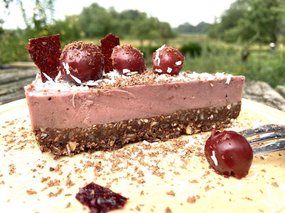 BereidingDoe de dadels in een kom en overgiet met heel heet water tot ze onder staan. Laat ca. 10 minuten staan. Doe de quinoamuesli in een foodprocessor, maal het fijn en doe het in een kom. Giet het water van de dadels af en maal ze fijn. Doe daarna de olie/boter erbij zodat deze smelt in de warme dadels. Doe dit bij de quinoamuesli, voeg de notenpasta , rauwe cacao, kokosrasp en psyllium toe en proef. Misschien wil je nog wat extra cacao toevoegen? Doe vervolgens het mengel in een taartbodem (het liefst eentje waar je de taart heel gemakkelijk weer uit kunt halen). Verdeel het mengsel egaal, druk heel stevig aan en zet het in de koelkast. Maak dan de topping: Pureer de bananen, het rode fruit en de kokosmelk. Zet het op het vuur en laat aan de kook komen. Zodra het kookt de agar agar (goed opgelost in wat koud water) toevoegen en nogmaals pureren om het klonter van de agar agar tegen te gaan. Laat 2-3 minuten zachtjes koken (niet korter omdat de agar agar dan niet optimaal geleert na afkoeling). Verdeel het egaal over de taartbodem en laat minimaal een paar uur opstijven in de koelkast. Garneer vlak voor het opdienen met één of meer van de suggesties.
