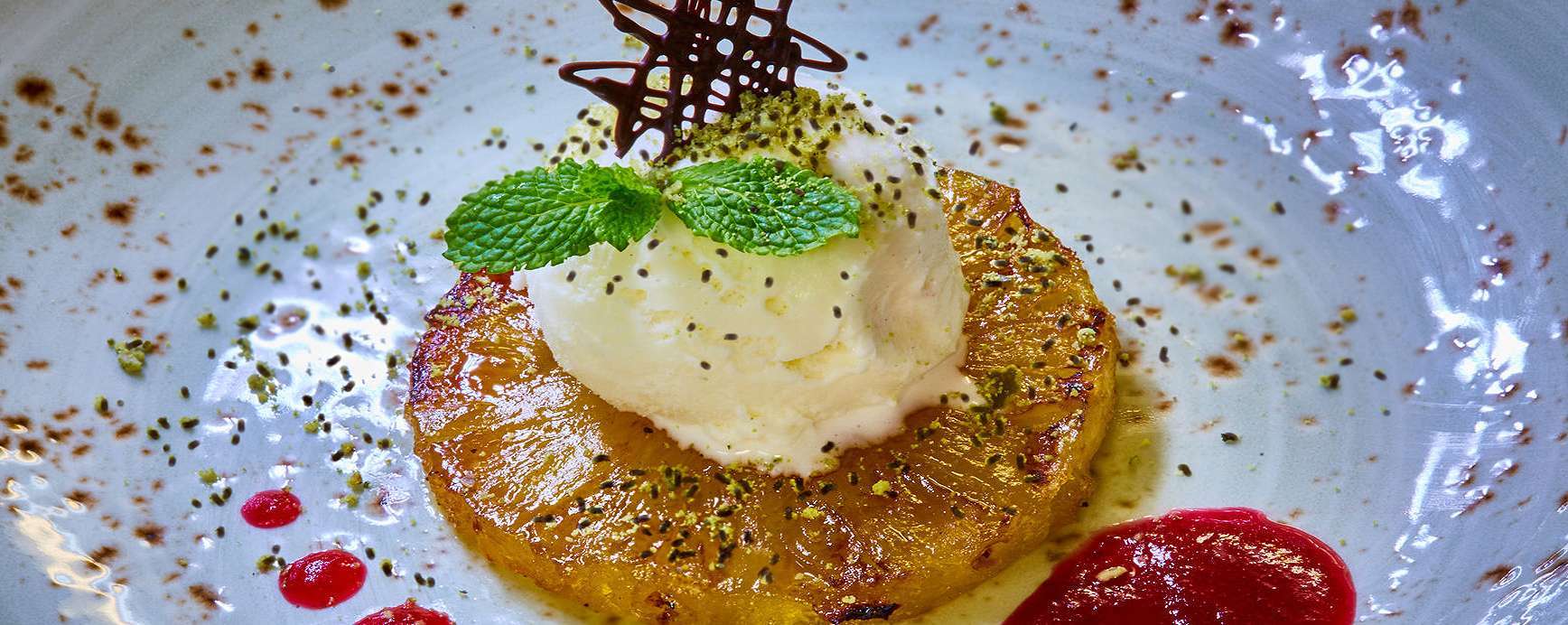 Schik de ananas op de borden (of in glaasjes) en serveer met de kokossorbet, werk eventueel af met een blaadje munt.