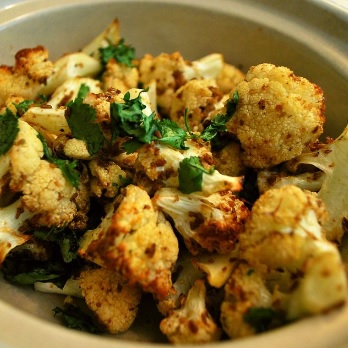 Verdeel de bloemkool in roosjes en stoom deze heel kort: ze mogen niet zacht worden, want dan vallen ze uit elkaar en wordt het papperig. Schil en rasp de gember. Snijd het pepertje in de lengte doormidden en verwijder de zaadjes. Snijd vervolgens de peper in kleine reepjes. Gebruik hierbij handschoenen, anders moet je je de komende uren steeds opletten dat je niet in je ogen wrijft! Laat in een pan met dikke bodem de kokosolie smelten, blijf continu roeren terwijl je hierin de geraspte gember met de curcuma verwarmt. Als de geuren van de curcuma vrijkomen na een minuutje of 2, kun je het fijngesneden pepertje, het koriander- en komijnzaad toevoegen. Bak nog een paar minuutjes onder voortdurend roeren. Voeg de bloemkool toe en blijf roeren. Bak deze ongeveer 5 minuten mee. Voeg dan het citroensap en de rest van de kruiden en het zout en peper naar smaak toe. Eet smakelijk!