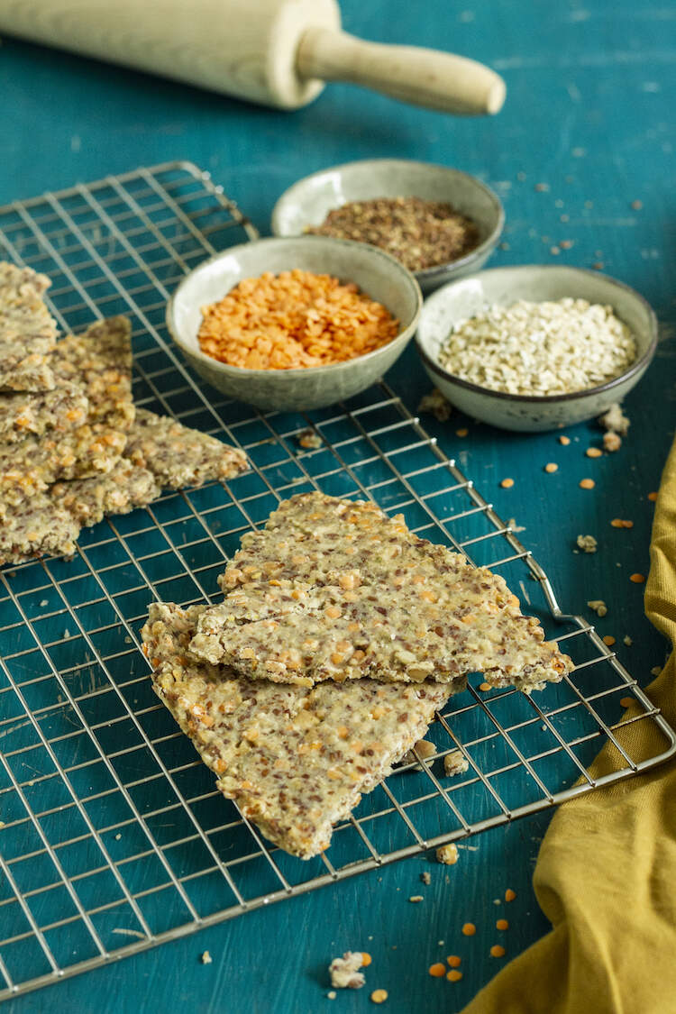 Week de linzen 15 minuten in 300 ml kokend of heet water. Voeg alle ingrediënten na een kwartier toe. Als je kikkererwtenmeel gebruikt, gebruik je gewoon warm water en kun je alle ingrediënten tegelijk door het water mengen. Proef even en voeg eventueel nog wat zout of specerijen toe. Zet een kwartier in de koelkast, voeg eventueel de baksoda toe. Verwarm de oven voor op maximaal 100 graden. Rol het deeg met een deegroller zo dun en egaal mogelijk tussen twee vellen bakpapier uit. Verwijder het bovenste vel en kerf met een pannenlikker repen in het deeg. Plaats de bakplaat in het midden van de oven en bak in 40-50 minuten gaar. Keer het brood halverwege de baktijd om*. Laat het goed afkoelen en koud worden: dan ontstaat het resistente zetmeel.