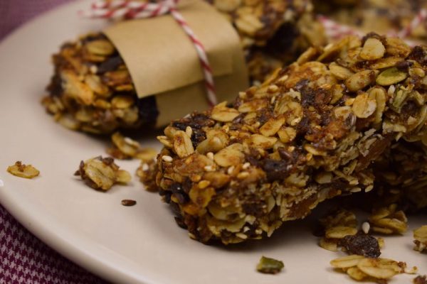 bakpapier storten en goed aandrukken. Velletje bakpapier er over heen leggen en 20 min in een voorverwarmde oven van 180 graden. Helemaal af laten koelen en in repen snijden.