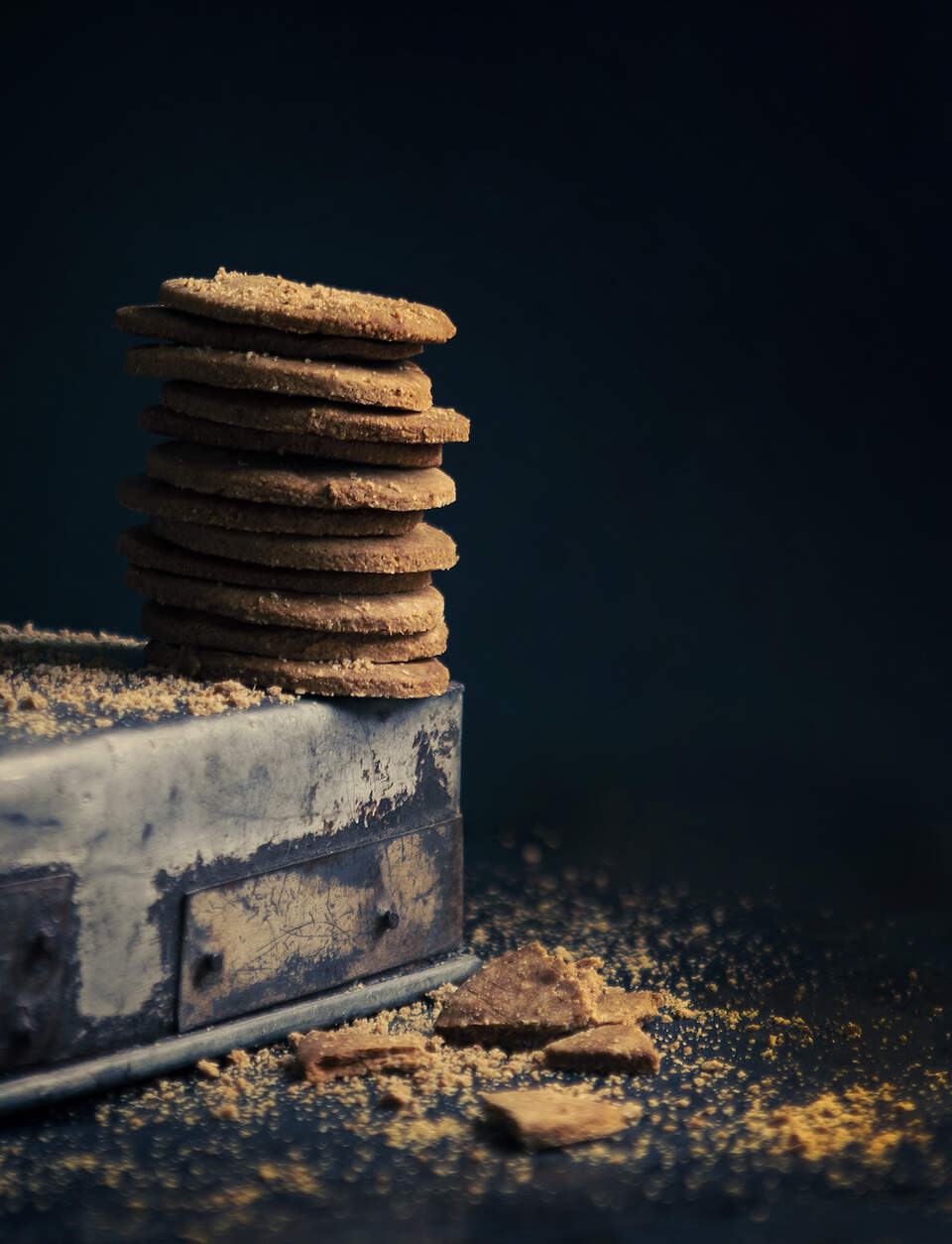 Leg het deeg op een stuk bakpapier. Doe dan huishoudfolie over het deeg en rol het egaal uit tot het overal ca. 3-5 mm dik is. Steek er koekjes uit met een ronde koekjessteker of een serveerring en leg ze op bakpapier op een bakplaat. Of maak er heel snel 'ruige koekjes' van: draai van het beslag circa 22 balletjes en druk deze plat op je bakpapier. Bak de koekjes in het midden van de oven in ca. 20 tot 30 minuten (afhankelijk van de dikte) lichtbruin en gaar. Neem ze uit de oven en laat ze afkoelen op een rekje.