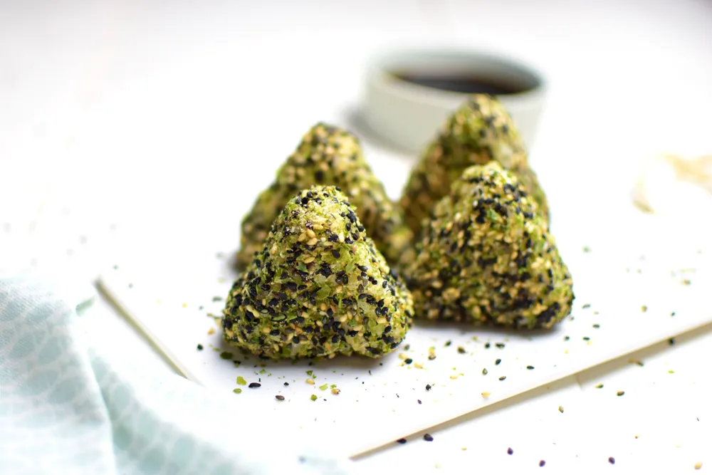 Onigiri is een soort sushi. Een Japans gerecht dat bestaat uit driehoekige, handgevormde rijstballetjes. In Japan worden ze meestal gevuld of omwikkeld zeewier (nori), ingemaakte pruim (umeboshi), zalm, tonijn, of andere smaakmakers. In dit makkelijke onigiri recept is een vegan gerecht zonder vis. We gebruiken furikake om de onigiri in te rollen. Furikake is een mix van sesam en zeewier. De rijst breng je op smaak met ingrediënten als rijstazijn en ahornsiroop. Je eet onigiri als hapje of bijgerecht. Lekker met andere typisch Japanse gerechten, zoals misosoep, tsukemono (ingelegde groente), gyoza, (fruit)salade of vegan yakitori. Onigiri is top om tijdens een gezellige avond met vrienden op tafel te hebben.