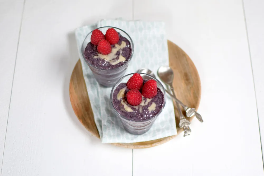Je kunt dit ook heel gemakkelijk een avond van tevoren klaarmaken. Meng dan het chiazaad, de amandelmelk, de kokosmelk, het maquipoeder en de ahornsiroop in een bakje en zet een nachtje in de koelkast.
