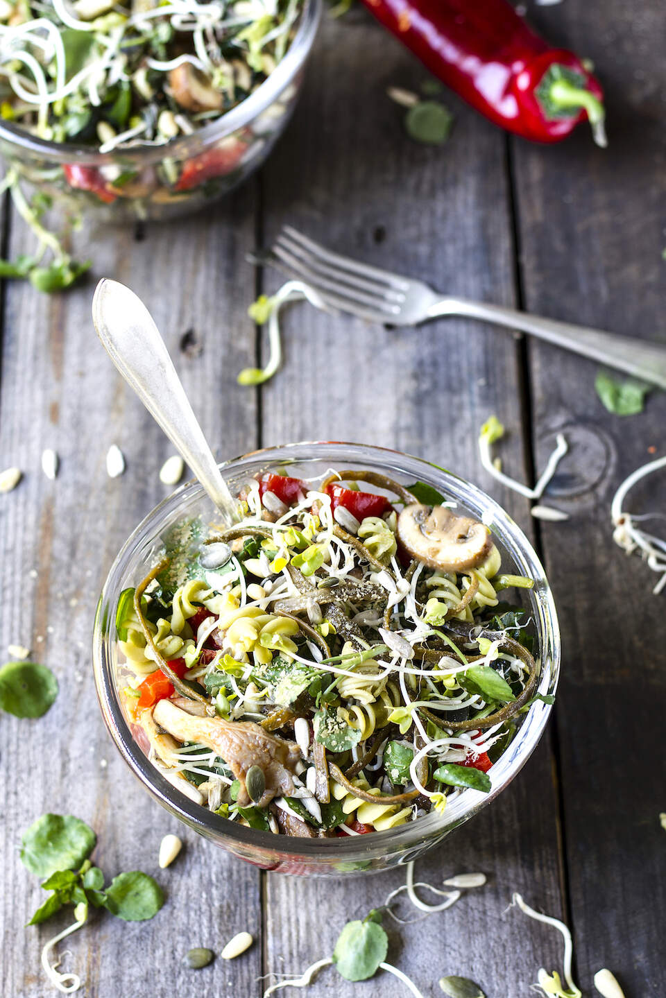 Kook de pasta (met een scheutje olie en azijn in het water) samen met de zeewiertagliatelle of kombu volgens de gebruiksaanwijzing op het etiket. Spoel goed af en laat het uitlekken. Fruit in een andere pan de gepelde en gesnipperde uien en knoflook in wat olijfolie op een zacht vuurtje. Voeg de specerijen toe. Snijd de paprika en paddenstoelen in grove stukken. Laat deze een paar minuten zacht mee sudderen en haal de pan van het vuur. Maak op smaak met peper, tamari/zout en naar smaak nog wat van de specerijen. Maak het af met nog een flinke scheut olijfolie en spatel de waterkers erdoor. Verdeel het over een bedje van pasta in je kom. Eten uit een bowl (kom) is hip, trendy, gemakkelijk, snel en ziet er leuk uit. Garneer rijkelijk met een of meerdere genoemde suggesties.