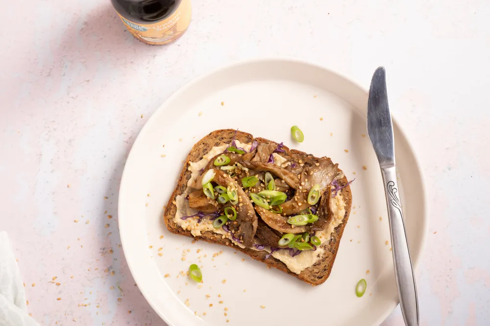 Oesterzwammen op brood, je ziet het vast wel eens op de lunchkaart staan. Wil je nu thuis een feestje maken van je lunch, dan is dit een simpel recept dat je in no-time klaar hebt staan. Zo maak je van je home-office gewoon een luxe kantine! De umami-saus in dit recept maakt de smaak helemaal af. Het umami van de paddenstoelen wordt nog eens extra versterkt door de umami-saus, en dat past perfect bij het proteïnebrood (of welk brood je er ook bij kiest) en de hummus en rode kool.