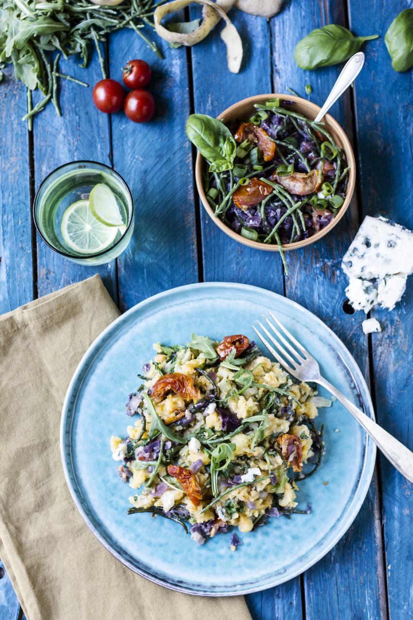 ** Soms is er in januari wel verse andijvie uit Nederland, soms ook niet. Ook met veldsla of winterpostelein is dit een overheerlijk en snel stamppotje.