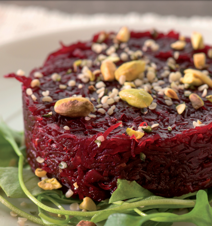 Schil de bietjes en kook of stoom ze gaar. Je kunt ze ook koken in de schil en de schil er na het afkoelen, onder de kraan, afwrijven. Schaaf ze fijn. Doe de sinaasappelrasp, de honing en het citroengras door de geraspte bieten. Hak de noten grof en meng het hennepzaad erdoor. Leg op 4 of 5 bordjes een handje groene blaadjes (en eventueel de quinoa*). Leg het rodebietenmengsel in een serveerring erbovenop en druk stevig aan. Doe vervolgens een kwart of een vijfde van het pistachemengsel in de serveerring en druk nogmaals stevig aan. Verwijder de serveerring en maak zo ook de volgende tartaartjes. Schenk vlak voor het opdienen de dressing erover. Als je het er niet zo feestelijk uit wilt laten zien, kun je de ingrediënten natuurlijk ook gewoon als een salade opdienen. Strooi de noten er dan pas op het laatst over en laat de groene blaadjes eventueel achterwege. Dan is het ook een perfecte meeneemsalade! Lekker als voorafje of als lunchsalade met een voedzaam soepje.
