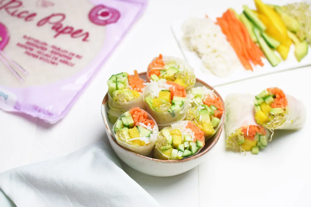 - Week de rijstvellen één voor één in heet water. Leg voorzichtig op een plank en beleg met een klein handje somen, komkommer, wortel, mango, alfalfa en twee plakjes avocado.
