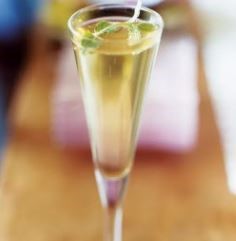 Vul de champagneglazen voor de helft met de groene thee en vul indien nodig af met de champagne en muntblaadjes.