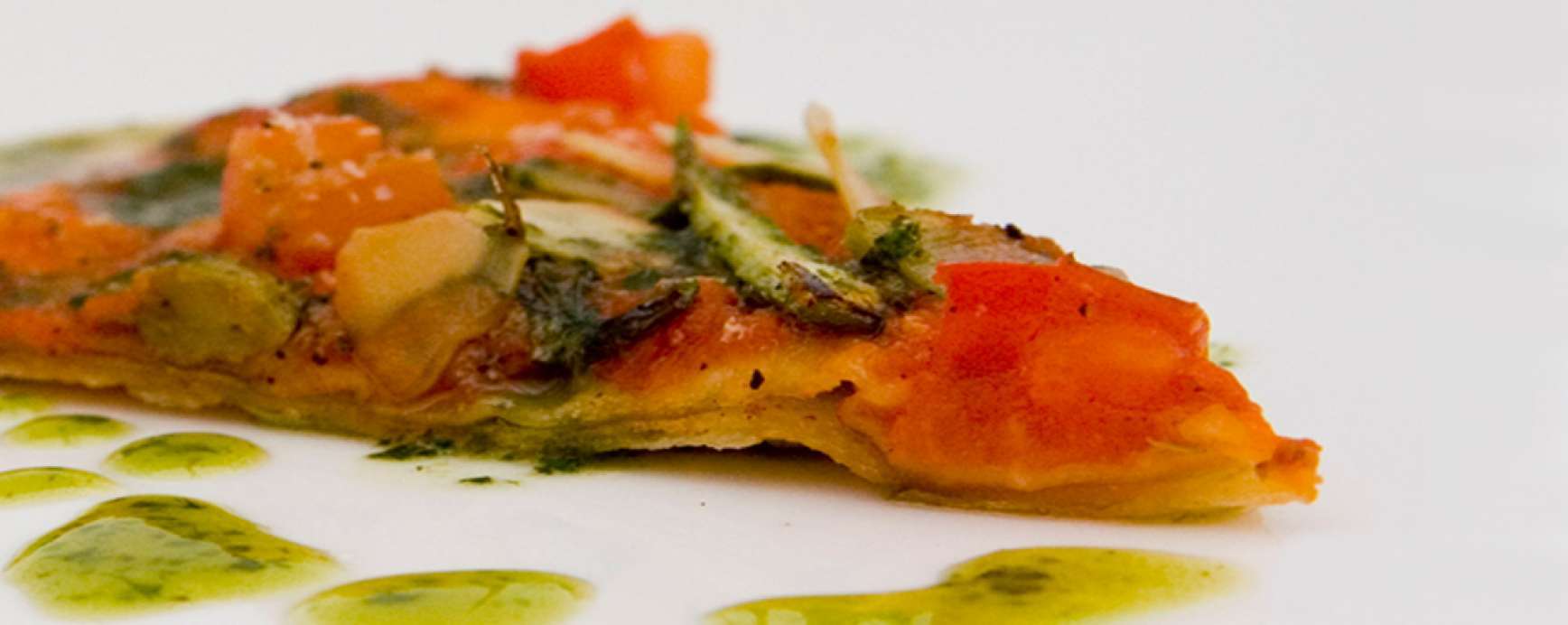 Ingrediënten voor tortilla's in pizza stijl met aspergepunten, amandel en basilicum olieSnijd de tomaten in stukken en snipper de ui en het knoflookteentje.