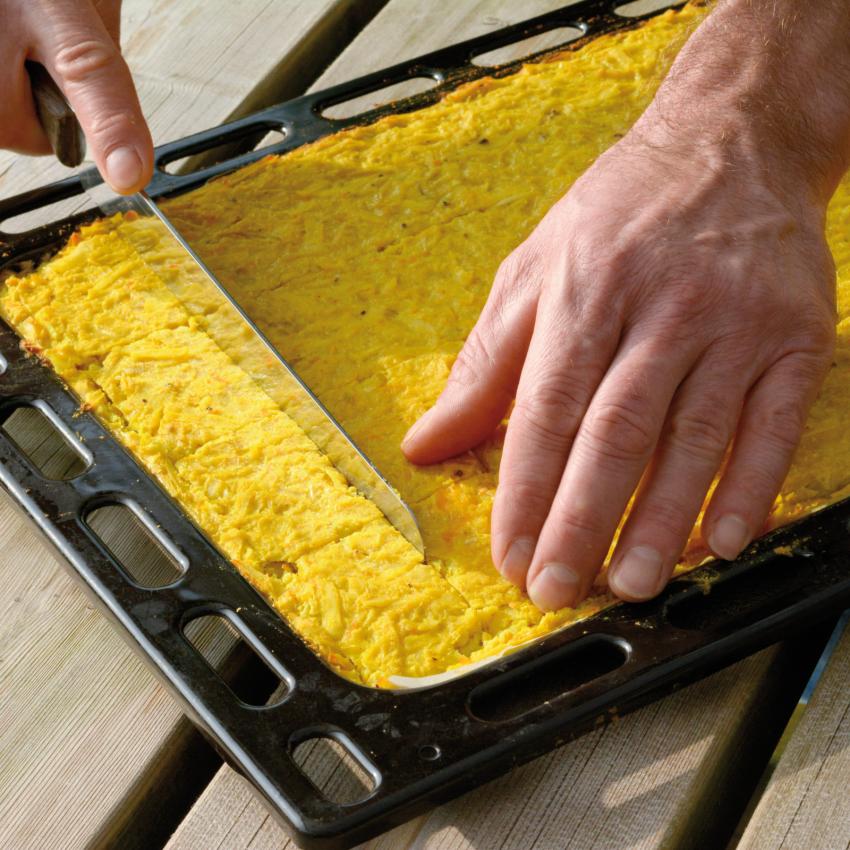 Als je snel wilt kun je- in plaats van raspen- de uien, appelen en aardappelen ook in een foodprocessor fijn hakselen.