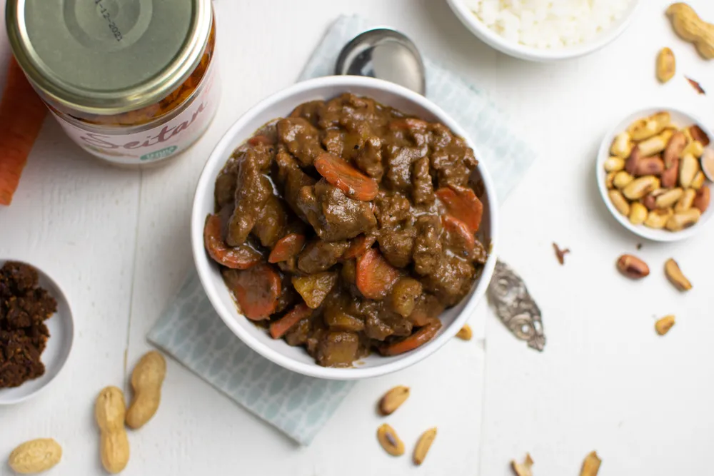 Massaman curry is één van de populairste Thaise curry's, en één van de makkelijkste om zelf te maken. Massaman is een milde curry met kokosmelk, vaak met als basis rundvlees. Dat doen wij natuurlijk lekker vegan, dus dit recept is met seitan. Een eiwitrijke vleesvervanger, ideaal voor vegans. De kruidenpasta voor massaman curry is heel kruidig, maar niet pittig. Er zit ook altijd pindakaas of pinda in een massaman curry, en dat maakt 'm ook zo lekker uniek voor de Thaise keuken. Pro-tip: maal de kruiden zelf. Gebruik dus hele zaden en niet de poeders. Dat zorgt voor bizar veel meer smaak. Je hebt dan wel een vijzel, kruiden- of koffiemaler of een blender nodig. Met een keukenmachine of staafmixer krijg je de kruiden niet mooi fijn.