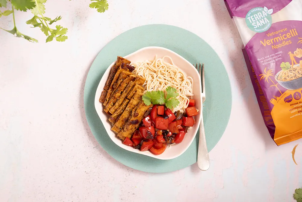 Hoe ziet jouw ideale noodlebowl eruit? Wij vullen onze kom het liefst met vegan ingrediënten die puur en biologisch zijn. Afstrepen maar! Onze vermicelli-noodles zijn gemaakt van bruine rijst. De teriyaki woksaus, waar je je tofu mee op smaak brengt, zit vol met goede, Japanse ingrediënten. Alle smaken zitten erin. We hebben het in dit vegan noodles recept simpel gehouden met paprika als hoofdgroente, maar je kunt natuurlijk zelf je favoriete groentes meebakken. Wat je in ieder geval niet moet overslaan, is de teriyaki woksaus van TerraSana. Die is niet te evenaren!