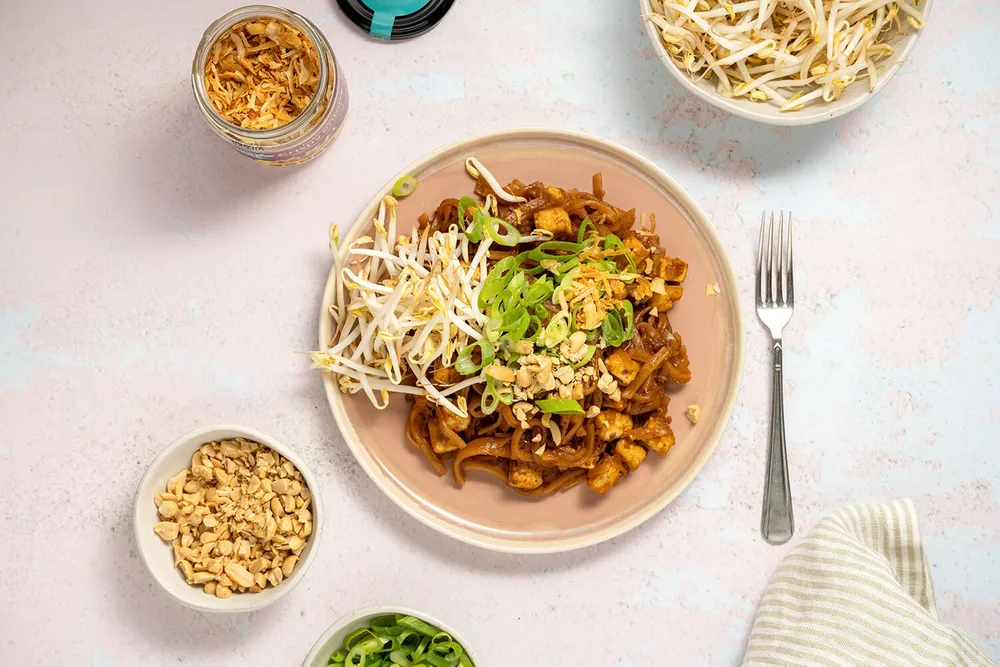 Houd je van oosterse gerechten en ben je vegan? Dan is deze vegan pad thai een absolute must-try! Bomvol smaak en zonder vlees of garnalen, dit gerecht is alles waar je van droomt! Denk aan stevige pad thai noedels, knapperige taugé en frisse lente-ui. De tofu zorgt voor extra textuur en eiwitten. Maar, de echte ster van dit gerecht is de boemboe, een mengsel van kruiden en specerijen dat zorgt voor de perfecte balans tussen pittig en zoet. Geen tamarinde in dit recept, maar geen zorgen - de combinatie van boemboe, ketjap en limoen zal je smaakpapillen op hol brengen! Het is tijd om de traditionele pad thai met vlees vaarwel te zeggen en jezelf te trakteren op deze verrukkelijke veganistische variant. Dus waar wacht je nog op? Hop, ga die keuken in en ontdek de smaken van Thailand met vegan pad thai.
