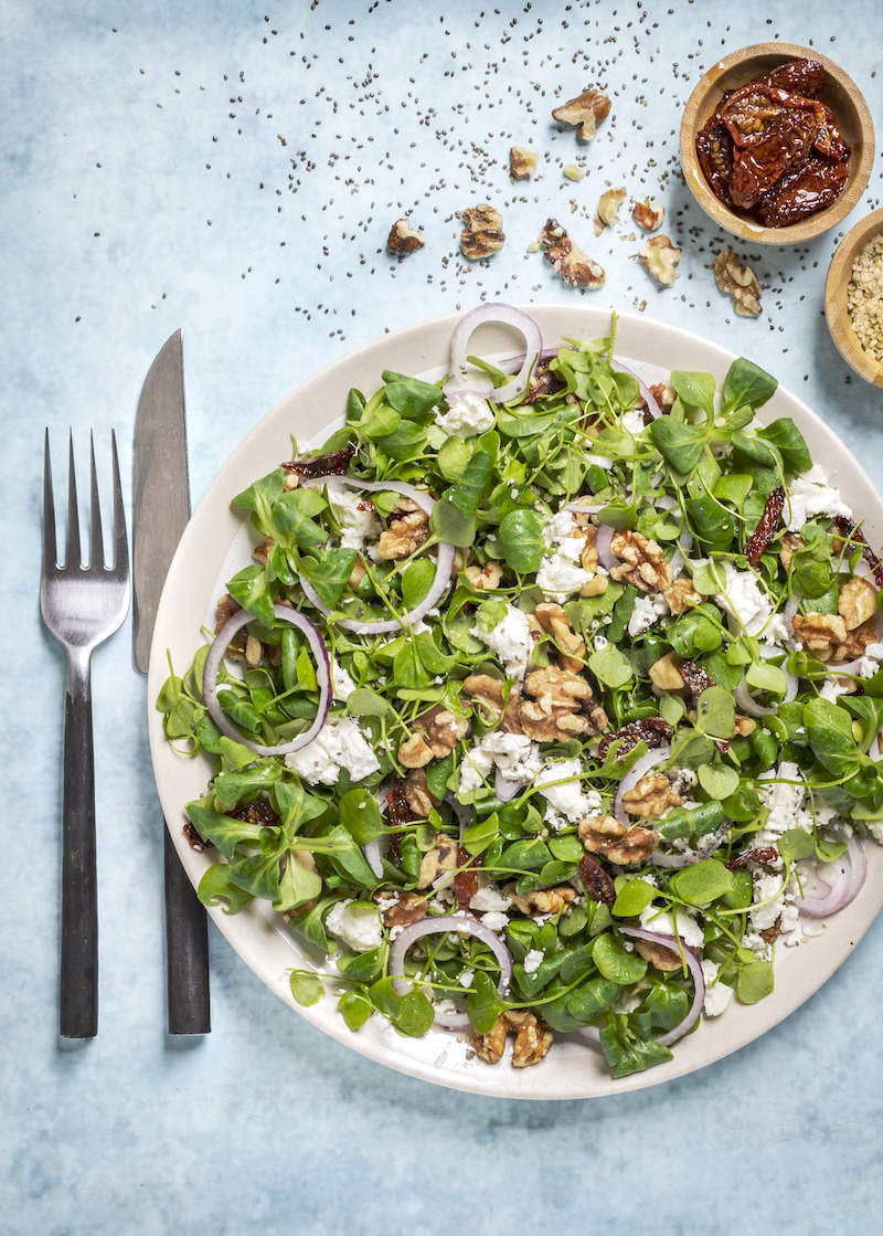 Het is algemeen bekend dat er in vis omega 3-vetzuren zitten. Maar de volgende ingrediënten in deze salade bevatten ook allemaal omega 3: winterpostelein, veldsla, hennepzaad, walnoten, chiazaad, walnoten-, koolzaad- en hennepolie en tot slot ook nog de schapenkaas. (omdat schapen normaliter buien lopen en gras eten bevat schapenzuivel een mooie hoeveelheid Omega 3) Wetenschappers zijn er van overtuigd dat mensen (vooral mannen) de omzetting vanuit plantaardige omega 3 naar de uiteindelijke werkzame stoffen EPA en DHA moeilijk maken en we dus vis MOETEN eten. Gelukkig voor de vissen worden er inmiddels ook andere geluiden gehoord: bij vegetariërs werden geen verlaagde niveaus van omega 3-vetzuren gemeten: Wellicht maken zij door andere voedsel- en leefstijlkeuzes deze omzetting toch.