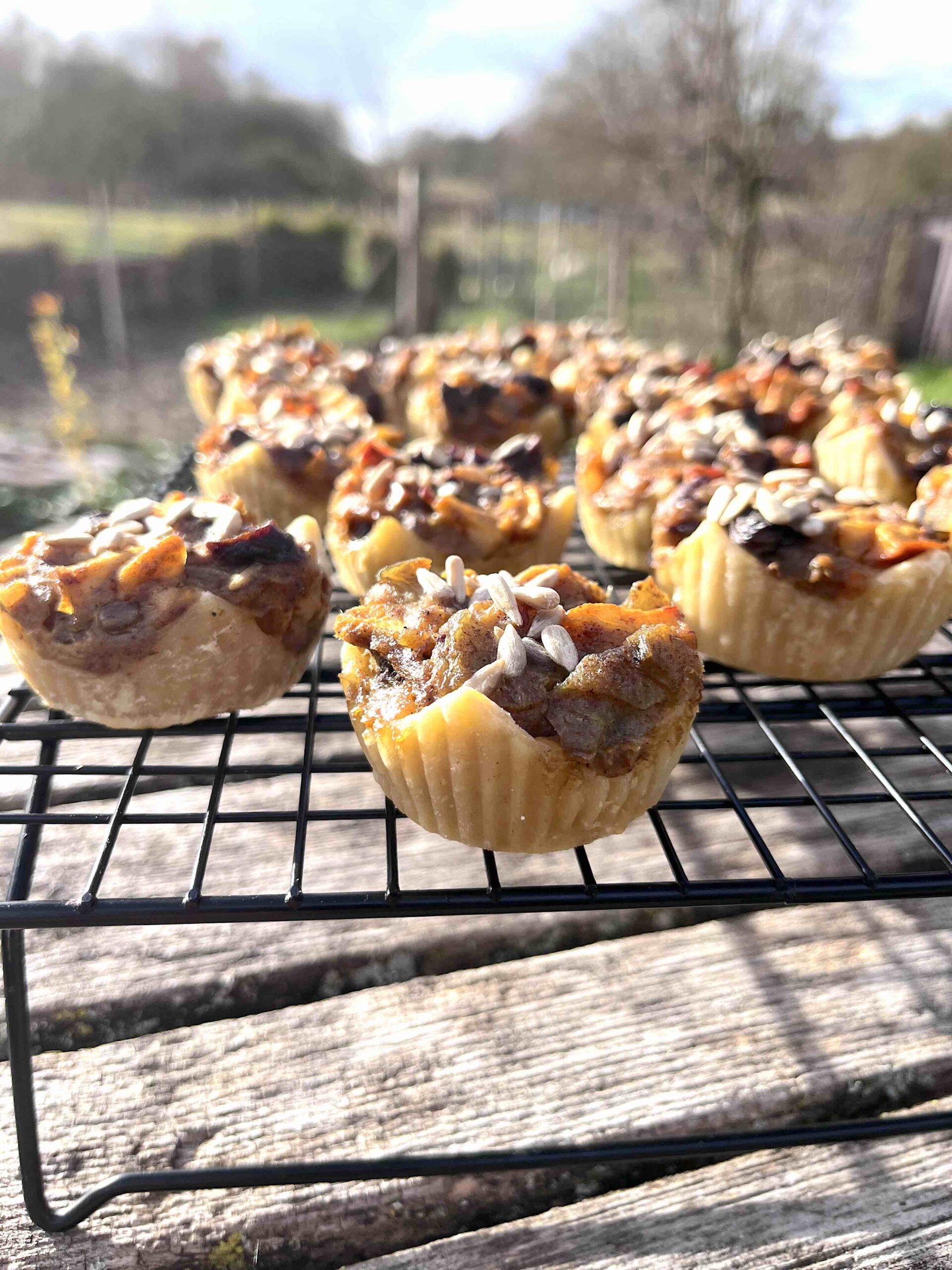 Verdeel het mengsel (ik doe het altijd met een juslepel) over de 24 bladerdeegbakjes. Bestrooi met noten, pitten of zaden.