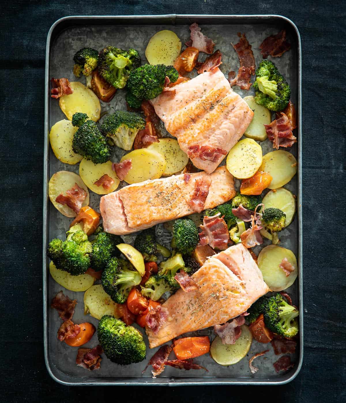Het is hip in culinair Nederland: alles op één bakplaat, de oven in en bakken maar! Superhandig om op deze manier een heerlijke maaltijd uit de oven te toveren. Waarom moeilijk doen als het makkelijk kan? In de braadslee die je bij deze maaltijd gaat gebruiken, zitten alle componenten voor een gezonde maaltijd. Omega 3 van de zalm, frisse groenten en lekkere aardappeltjes.