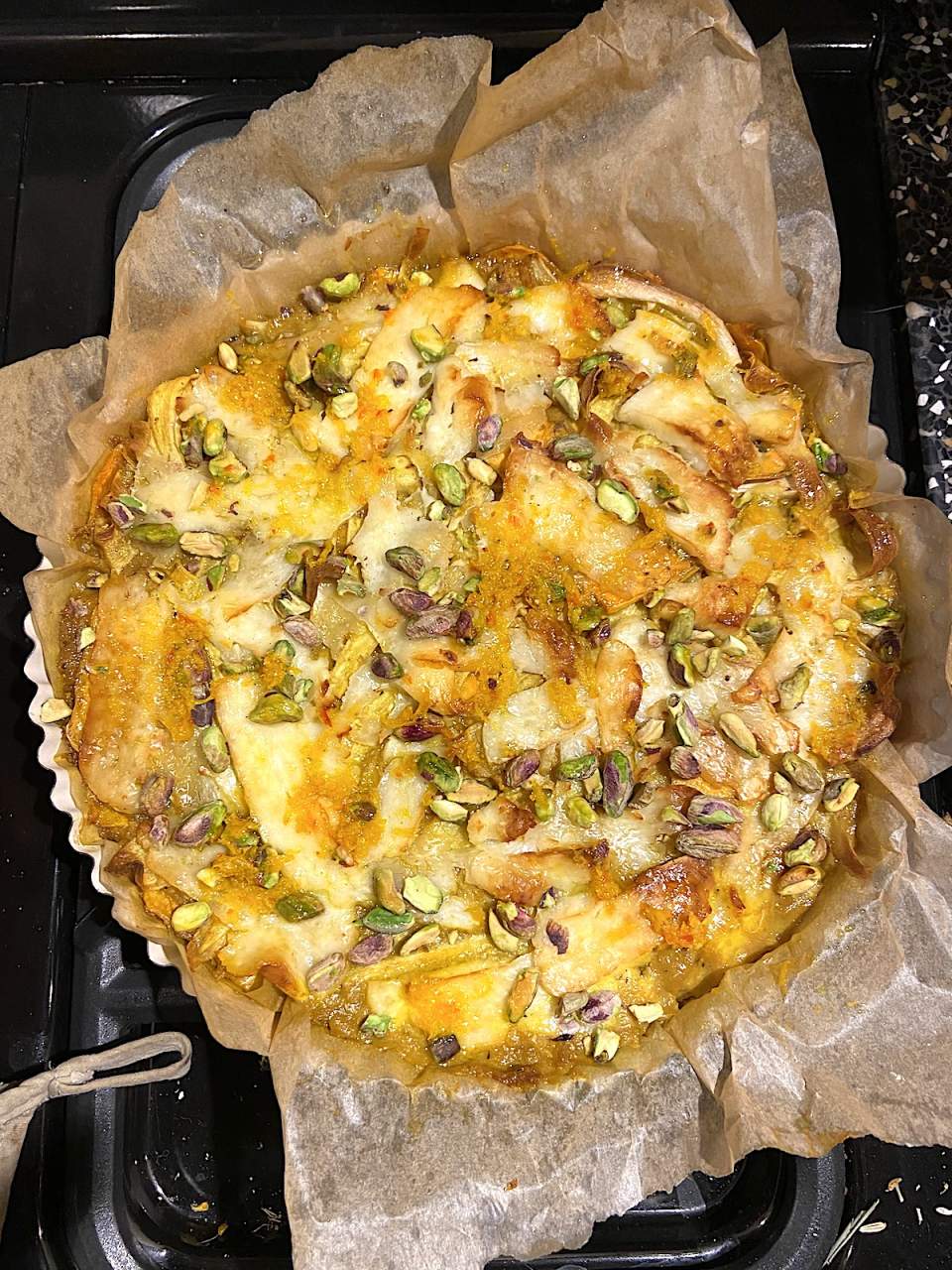 Schil de zoete aardappel en pastinaak. Snijd daar in verticale richting dunne repen van maximaal een halve cm. van. (Het makkelijkst gaat dit met een mandoline) Bekleed een quichevorm met bakpapier en bestrijk dit met olijfolie. Leg de helft van de repen pastinaak en zoete aardappel dakpansgewijs op de bodem. Spreid hier de witte bonen/lupine over. Maak de bechamelsaus door alle ingrediënten in een kom te doen en te mengen tot een egale massa. Giet de helft van deze saus over de pastinaak/zoete aardappel. Dek dan af met de rest van de repen pastinaak/zoete aardappel. Giet vervolgens de andere rest van de saus erover. Snijd de halloumi in dunne plakjes en leg deze over de bechamelsaus. Zet 40-45 minuten in een voorverwarmde oven op 140 graden. Strooi, nadat je de lasagne uit de oven gehaald hebt, er de gemengde noten over. Erg lekker om te serveren met wat zuurkool, gegrilde groente of een groene salade.