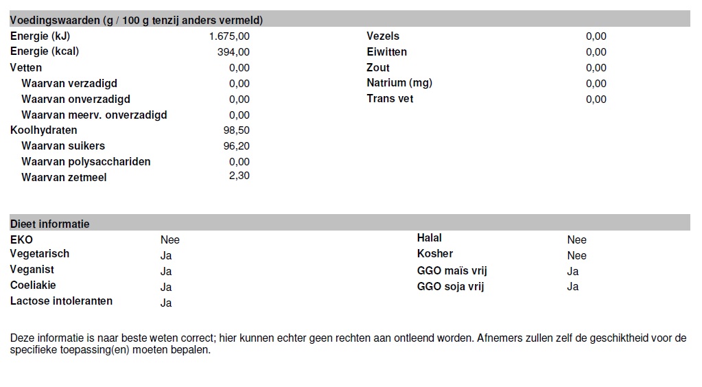 Energie (kJ) 1.598, Energie (kcal) 376, Vetten 0, Waarvan verzadigd 0, Koolhydraten 94, Waarvan suikers 92, Vezels 0, Eiwitten 0, Zout