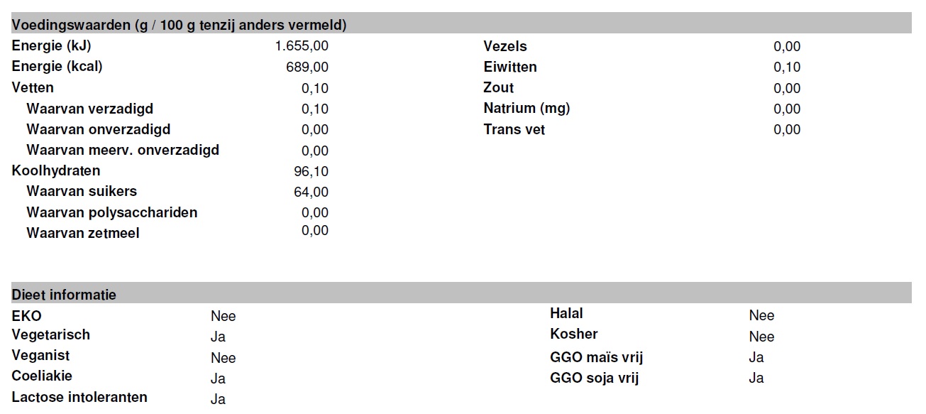 suiker, glucosestroop, honing, kandijsuiker