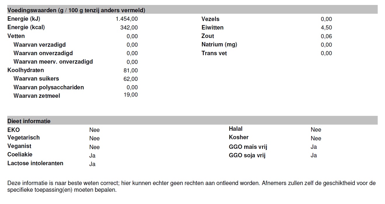 Energie (kJ) 1.415, Energie (kcal) 335, Vetten 0,5, Waarvan verzadigd 0,1, Koolhydraten 77, Waarvan suikers 60, Vezels 0, Eiwitten 6, Zout 0,06.