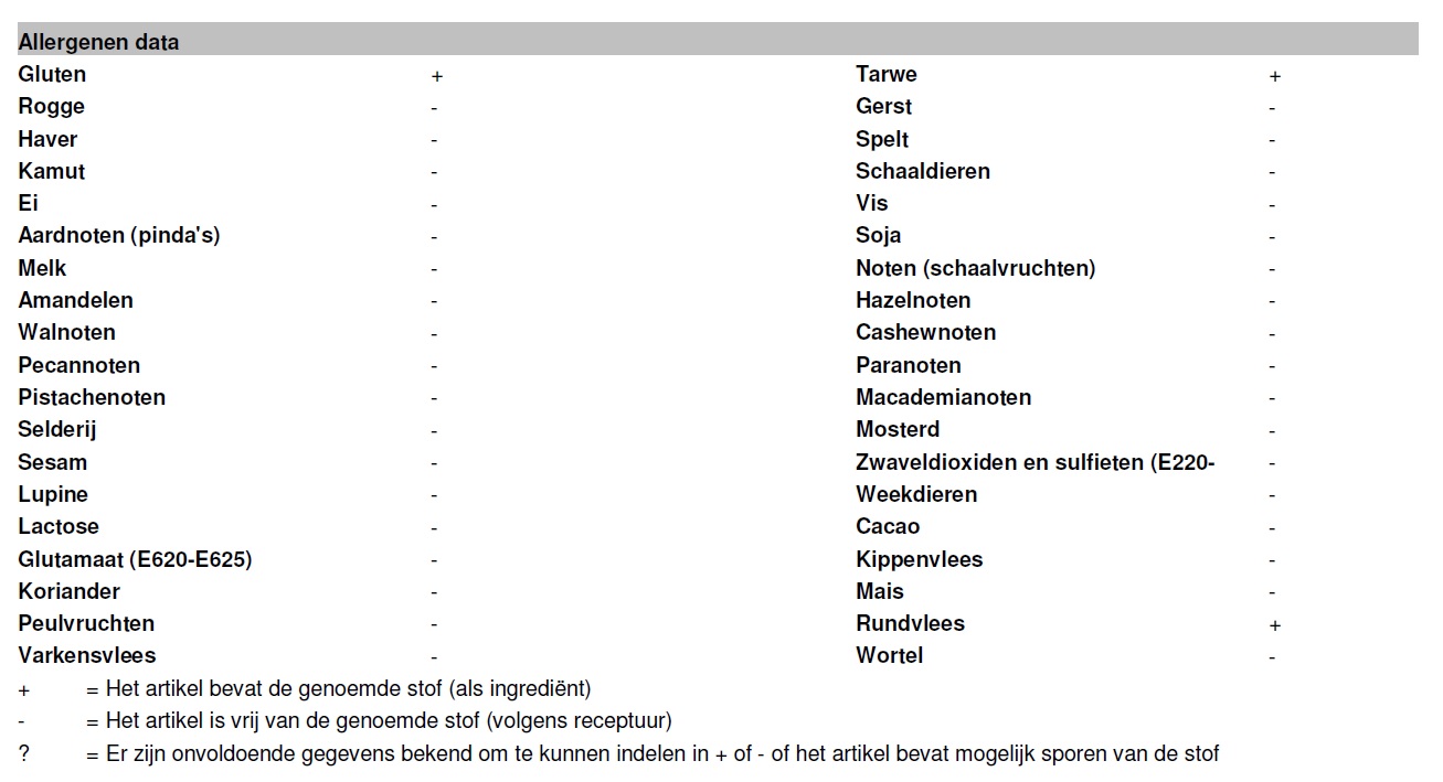 Energie (kJ) 1.399, Energie (kcal) 330, Vetten 2,2, Waarvan verzadigd 1,8, Koolhydraten 73,7, Waarvan suikers 59,5, Vezels 0,53, Eiwitten 4,1, Zout 0,43.
