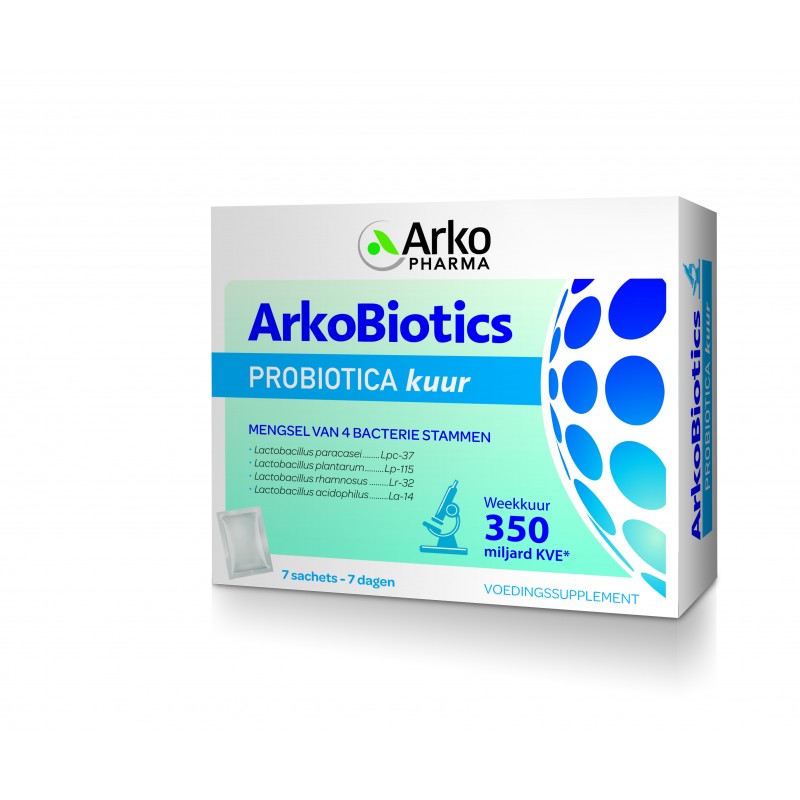 ArkoBiotics combineert 4 hooggeconcentreerde microbiotische stammen die in synergie werken.De ArkoBiotics probiotica weekkuur bevat 350 miljard KVE* levende melkzuurbacteriën. Deze hoeveelheden zijn nodig om de reis door het maag- darmkanaal te overleven en uw darmen weer goed te koloniseren.