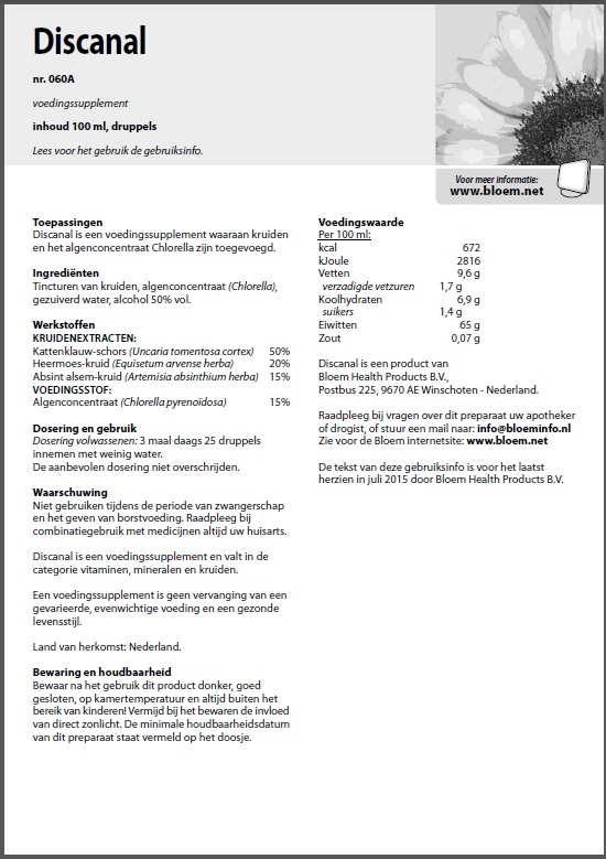 Discanal is een voedingssupplement waaraan kruiden en het algenconcentraat Chlorella zijn toegevoegd.