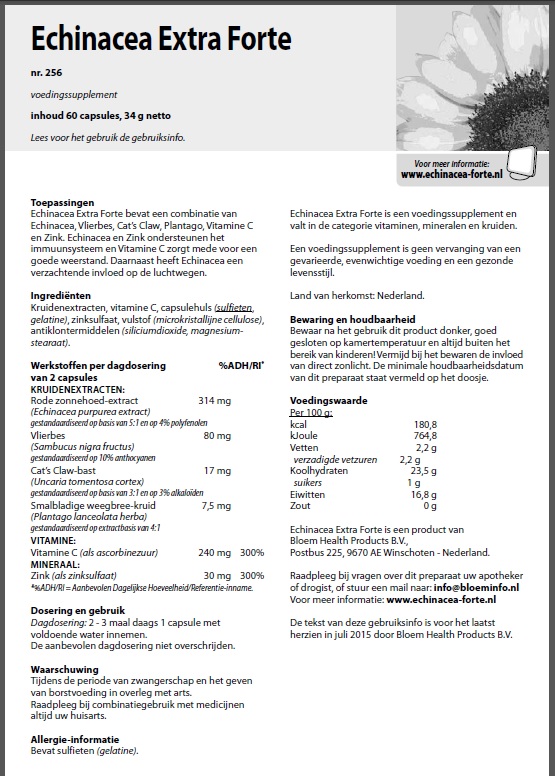 Echinacea Extra Forte bevat een combinatie van Echinacea, Vlierbes, Cat's Claw, Plantago, Vitamine C en Zink.